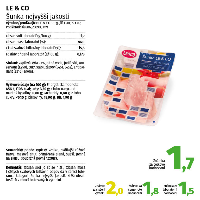 V rámci laboratorního zkoušení byly ověřeny deklarované výživové hodnoty, obsah masa, čistých svalových bílkovin a přidaných fosfátů.