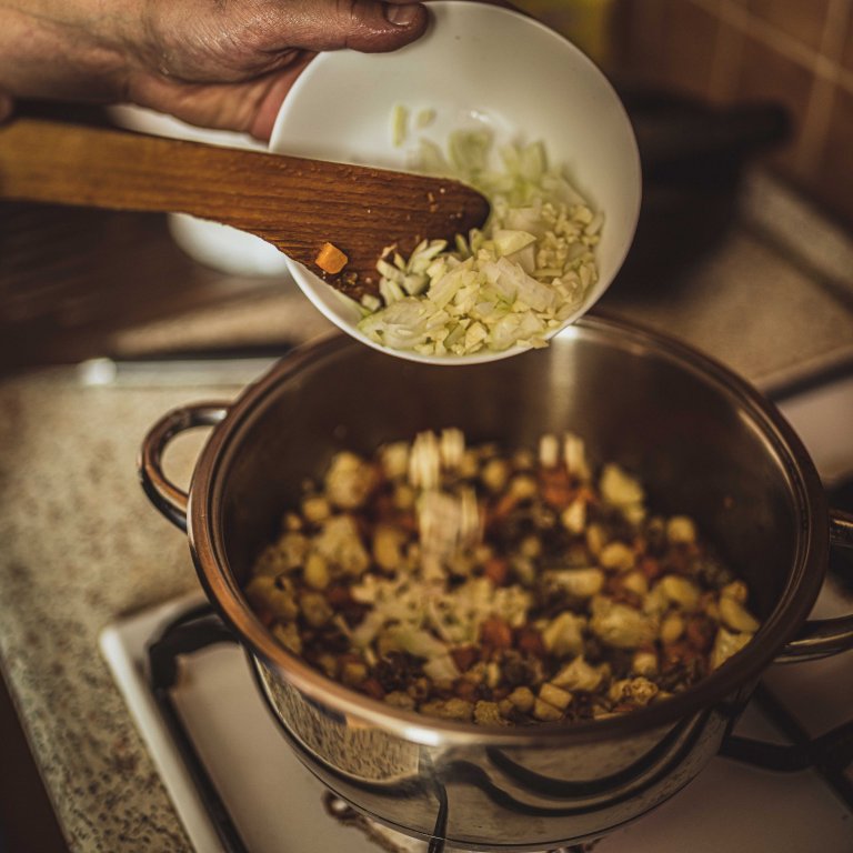 - 2. Poté přidáme houby a cibuli a restujeme dalších 10 minut. Na konec přihodíme rozmačkaný česnek, sušené houby a drcený kmín. Celý základ zaprášíme 1 lžící hladké mouky a orestujeme.