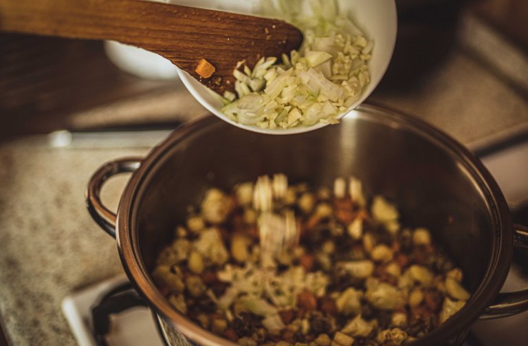 - 3. Základ zalijeme vývarem a zavaříme. Poté přidáme brambory nakrájené na kostičky.