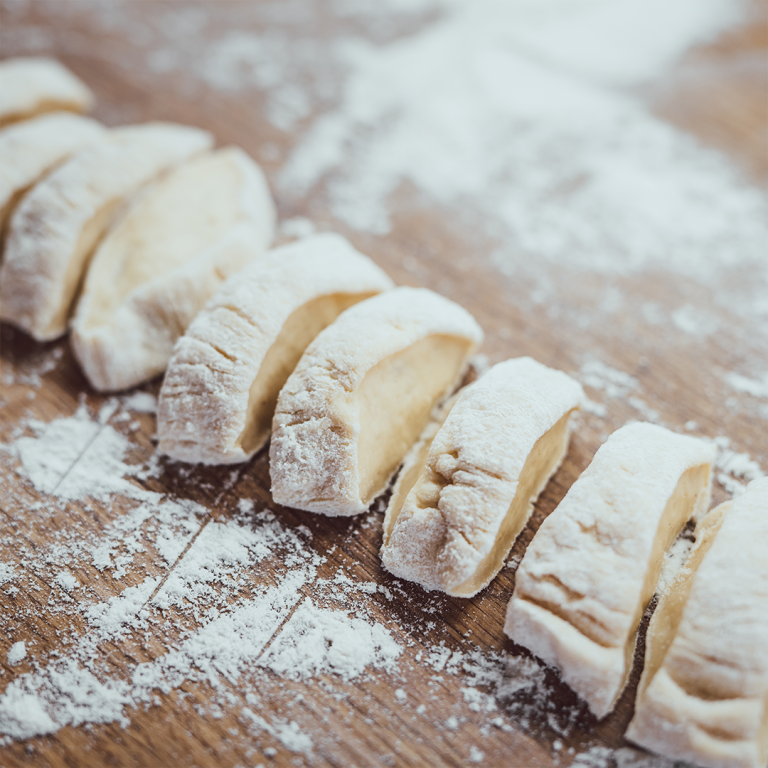 - 6. Vykynuté těsto rozdělte na několik dílů a vyválejte stejně tlusté válečky, které nožem rozkrájíte na stejné díly (asi 2 × 3 cm).