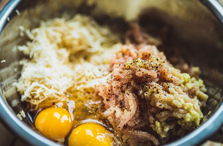 - 1. Krůtí prso nameleme v mlýnku, celer a zázvor nastrouháme najemno a smícháme s krůtím masem. Přidáme koření, sůl, černý pepř a 50 ml olivového oleje. Směs dobře promícháme.