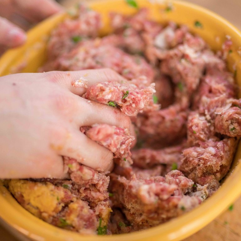 - 3. Maso a ostatní ingredience dobře promíchejte a dochuťte solí a pepřem.