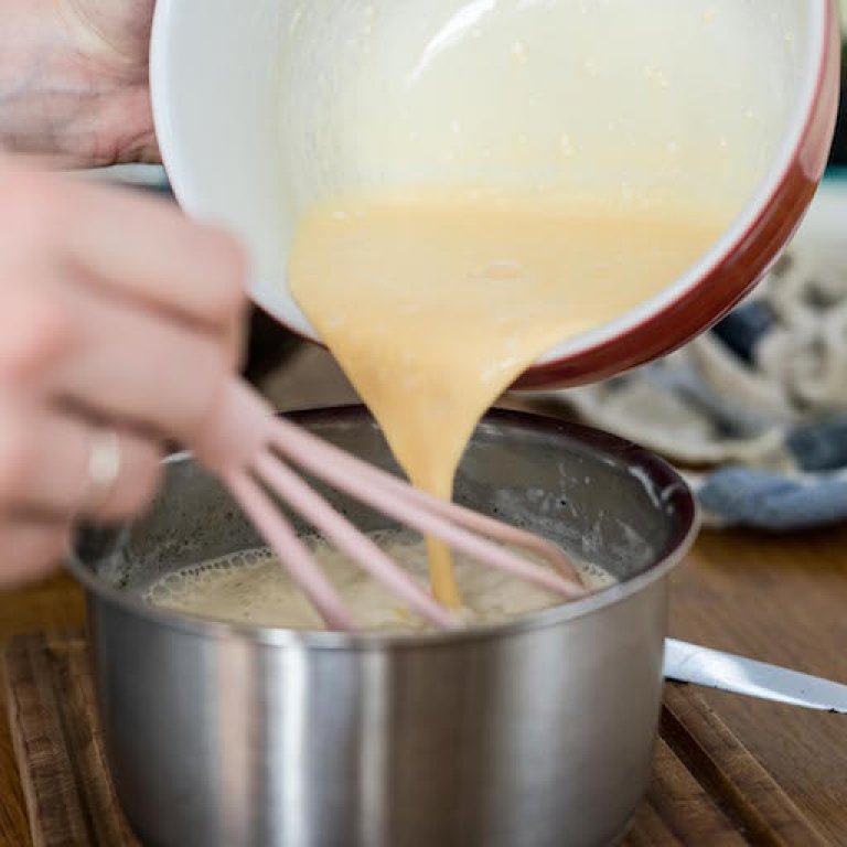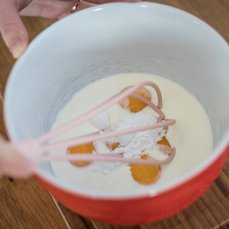 - 5. Zbylou smetanu vyšlehejte se žloutky a škrobem. Žloutkovou smetanu postupně zašlehejte do horké směsi v kastrůlku.