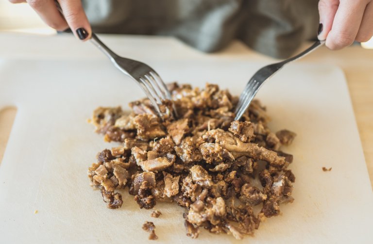 - 9. Poté maso podlijte 150 ml vody a dejte péct na cca 2–3 hodiny na 150 stupňů, dokud se nebude doslova rozpadat. Pak natrhejte maso vidličkou na kousky.