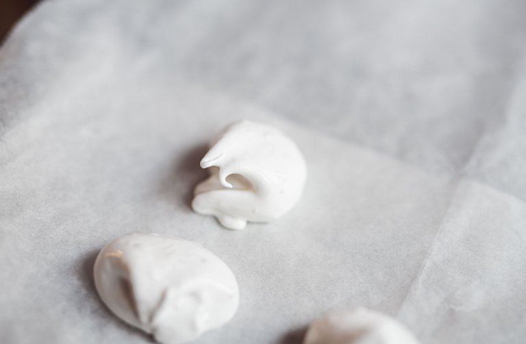 - 3. Hotovou hmotu klademe lžící na pečicí papír. Můžeme použít cukrářský pytlík.