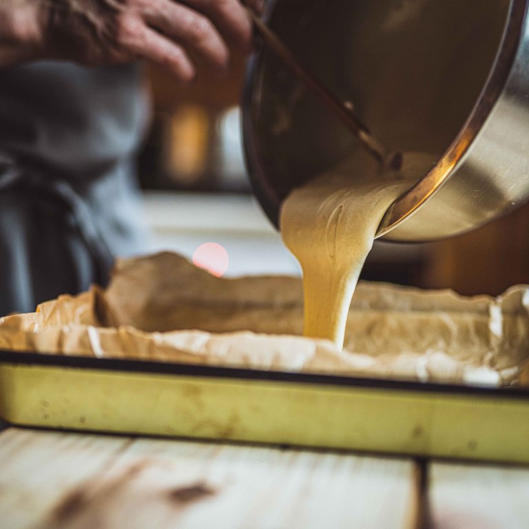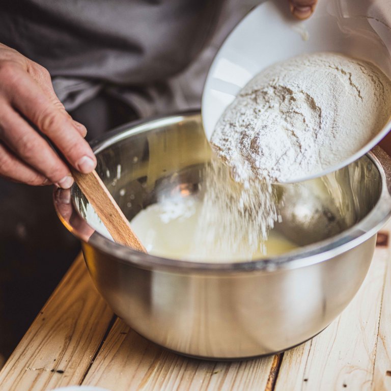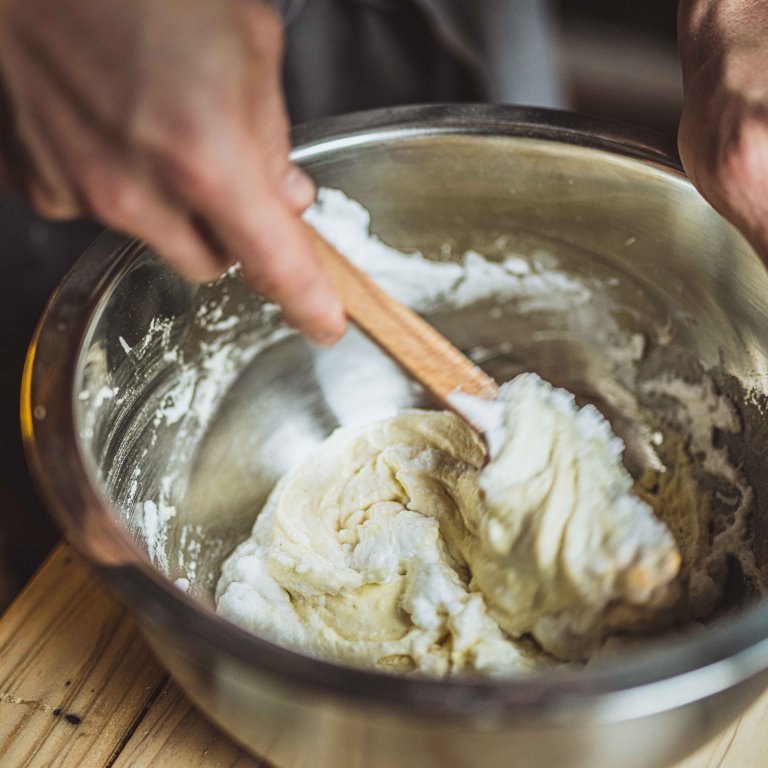 - 1. V míse vyšleháme žloutky s cukrem, poté přidáme vodu, tuzemák a znovu šleháme. Pomalu přisypáváme mouku smíchanou s kypřicím práškem.