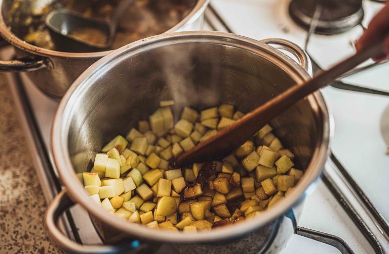 - 1. Z cukru uděláme světlý karamel a vložíme do něj na kostičky nakrájená jablka. Přisypeme skořici a vyvaříme šťávu z jablek.