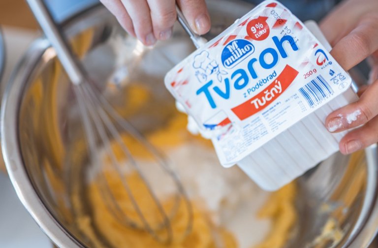 - 2. Do vzniklé pěny přidejte tvaroh a špetku soli, krupičku a prášek do pečiva.