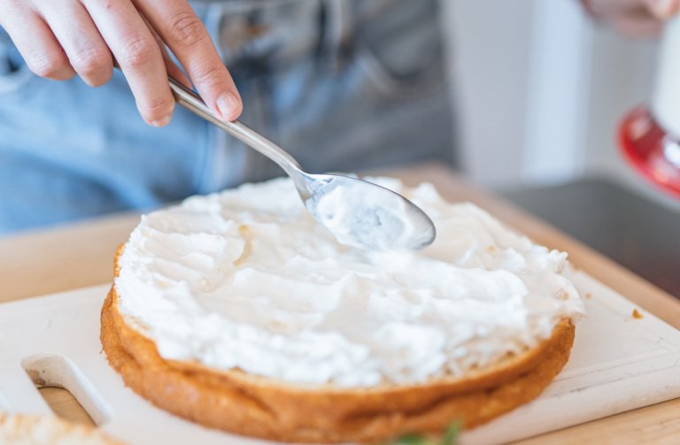 - 5. Na krém vyšlehejte cukr, jogurt, máslo a žervé. První polovinou krému potřete vršek spodní části korpusu, na tu dejte vrchní část korpusu a tu potřete zbylou polovinou krému.