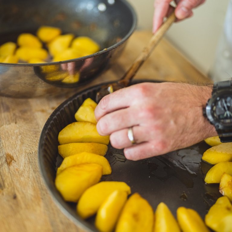 - 2. Jablka oloupeme, vyjadřincujeme a nakrájíme na šestiny. V pánvi rozpustíme 100 g cukru a za stálého míchání necháme cukr zkaramelizovat. Poté přidáme máslo, jablka, vše promícháme a pánev odstavíme.