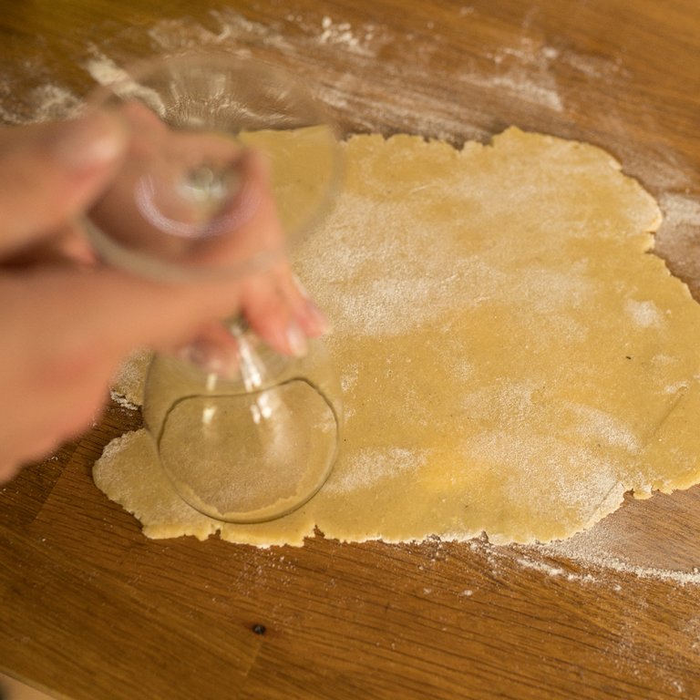 - 2. Vychlazené těsto vyválejte (cca na 3 mm) a skleničkou vykrájejte kolečka.