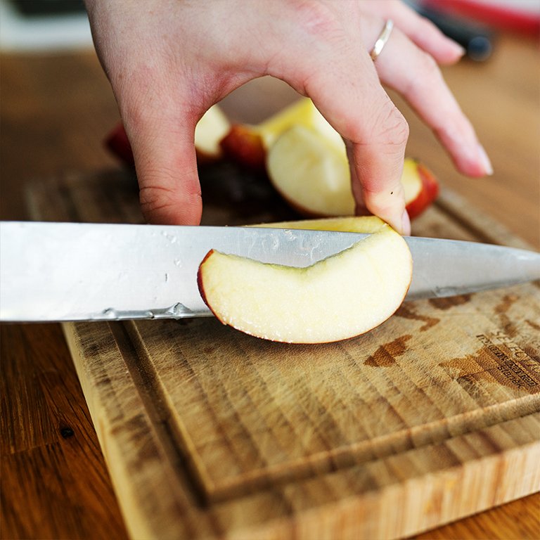 - 6. Jablka zbavte jadřinců a nakrájejte na tenčí měsíčky.