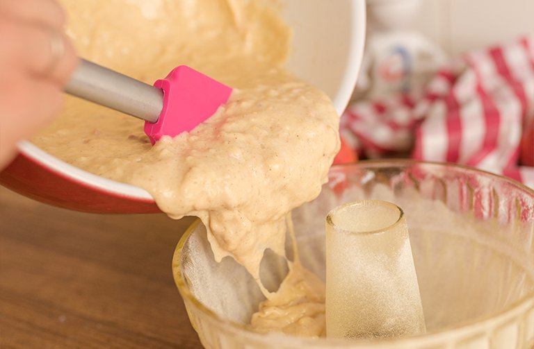 - 4. Spojte obě části a vypracujte z nich hladké těsto. To vlijte do formy a pečte v troubě předehřáté na 180 °C asi 40 minut, nebo dokud bábovka není hotová. To můžete vyzkoušet pomocí špejle.