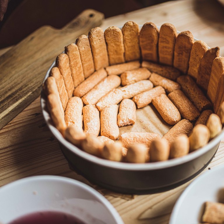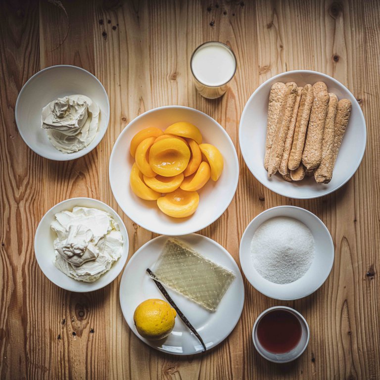 - 1. Cukrářské piškoty zkrátíme o 20 % a skládáme je pocukrovanou stranou ven podél ráfku dortové formy. Piškoty jsou namočené ve šťávě z broskví a griotky. Zbytky piškotů dáme na dno formy.