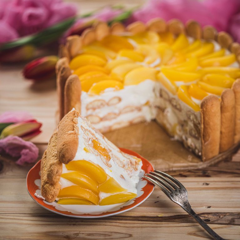 Venku už pomalu teploty stoupají, proto nastal čas připravit si nepečený dort provoněný a proslazený ovocem. Aby byl opravdu jemný, přimíchali jsme k tvarohu také smetanu ke šlehání. Dort lemují piškoty namočené ve šťávě z broskví a v griotce. Ty jsme také použili na spodek dezertu a další vrstvení, kdy se střídají s nadýchanou tvarohovou směsí a šťavnatými broskvemi. Pokud toužíte po jiném ovoci, vyberte si podle vašeho přání. Už se vám také sbíhají sliny?