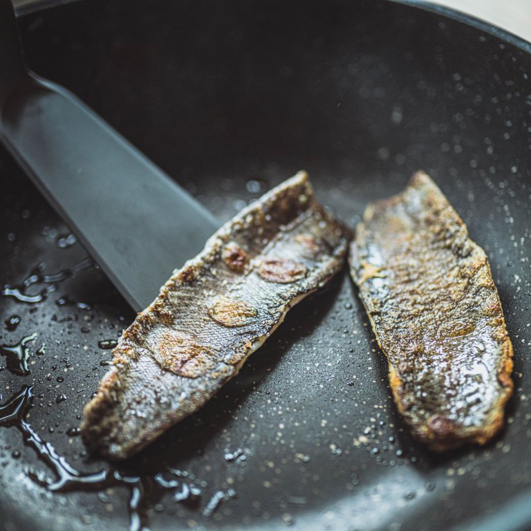 - 4. Pstruha zbavíme šupin, připravíme z něj čtyři filety bez kosti. Rozpálíme pánev nalijeme dvě lžíce oleje a pečeme na kůži cca 2 minuty. Přidáme zbytek másla, filety otočíme a vypneme sporák. Filety necháme ještě minutu odležet na pánvi.