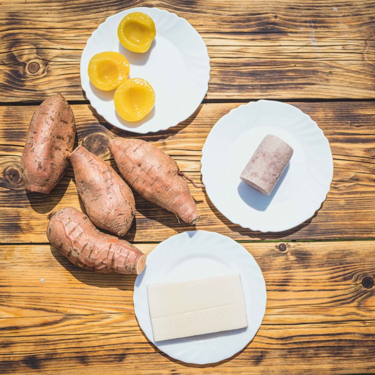 - 2. Mezitím si nakrájíme šunku, sýr a broskev na malé kostičky. Rozpůlené batáty posypeme nakrájenou broskví, šunkou a kostičkami sýra.