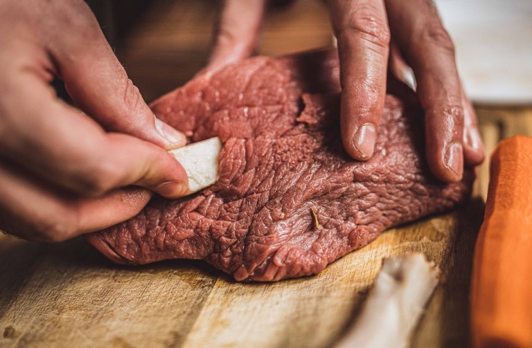 - 1. Hovězí maso očistíme, prošpikujeme mrkví, špekem, osolíme a opepříme.