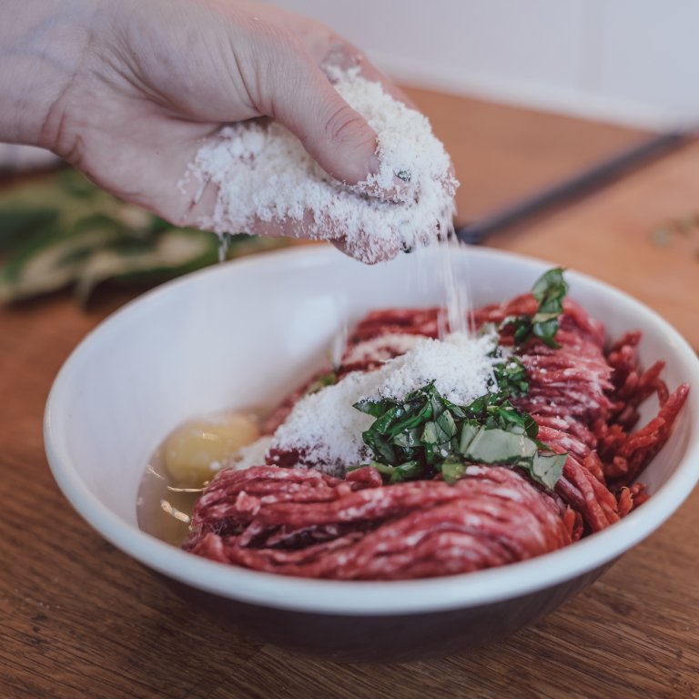 - 1. Mleté maso smíchejte se sýrem, vejcem a nadrobno nasekanou bazalkou (asi 1 hrst).