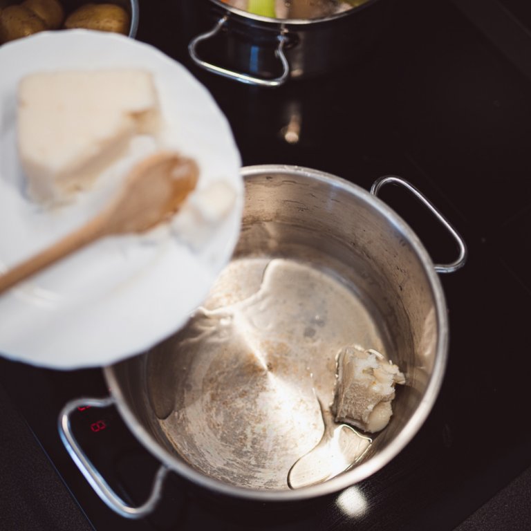 - 1. Na rozehřátém sádle orestujeme najemno nakrájenou cibuli a slaninu. Přidáme najemno nasekaný česnek a krátce orestujeme. Zalijeme hovězím vývarem, přidáme oloupané brambory na kostičky, drcený kmín, sůl a pepř.