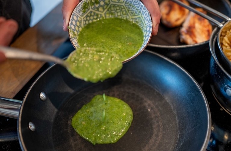 - 3. Těstoviny uvaříme dle návodu. Do těstovin přidáme pažitkové pesto a dochutíme.