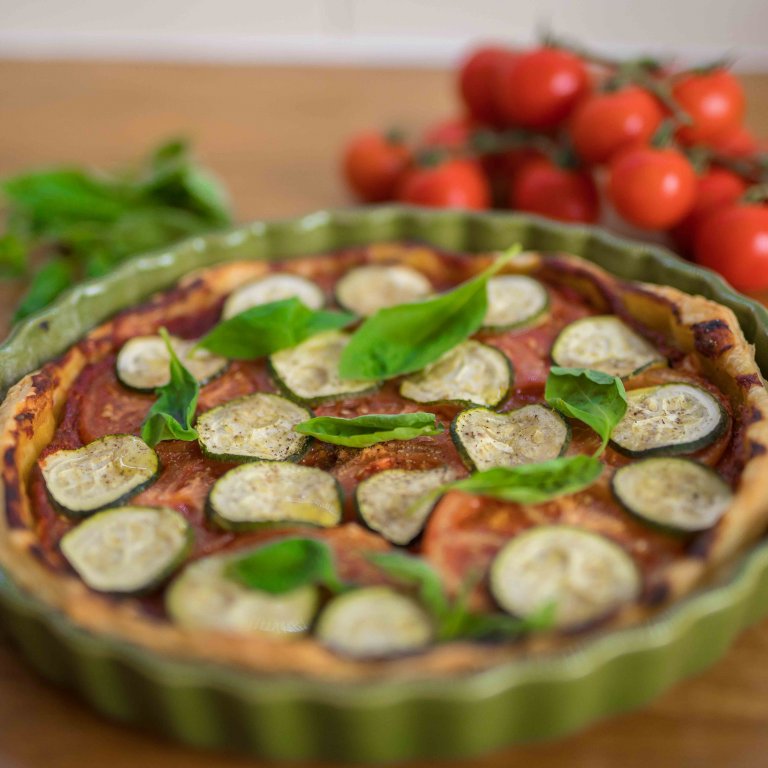 - 4. Cuketu i rajčata nakrájejte na kolečka a poklaďte na koláč.
