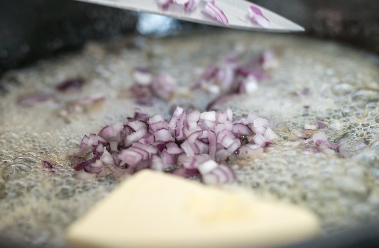 - 4. Na stejné pánvi, kde jste připravovali maso, rozpusťte máslo a vložte do něj nahrubo nasekanou šalvěj a najemno nasekanou cibulku.