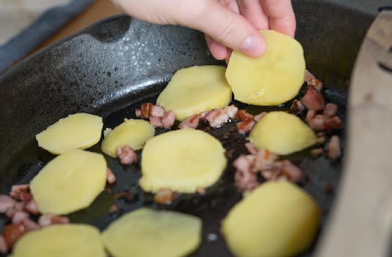 - 2. V pánvi (zvolte takovou, kterou můžete vložit i do trouby) orestujte slaninu a krátce nechte opéct i plátky brambor.
