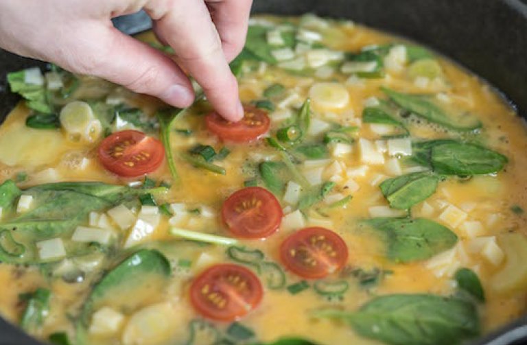 Máte rádi pečená vejce? Vyzkoušejte recept na zapečenou omeletu se sýrem, rajčaty a špenátem, kterou doplňují plátky brambor. I díky nim je tato omeleta vhodná nejen ke snídani, ale můžete ji podávat jako rychlé hlavní jídlo.