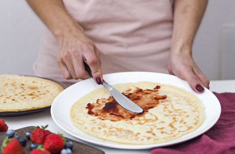 - 3. Palačinky potřete oblíbeným džemem nebo tvarohem a přeložte je na čtvrtiny.