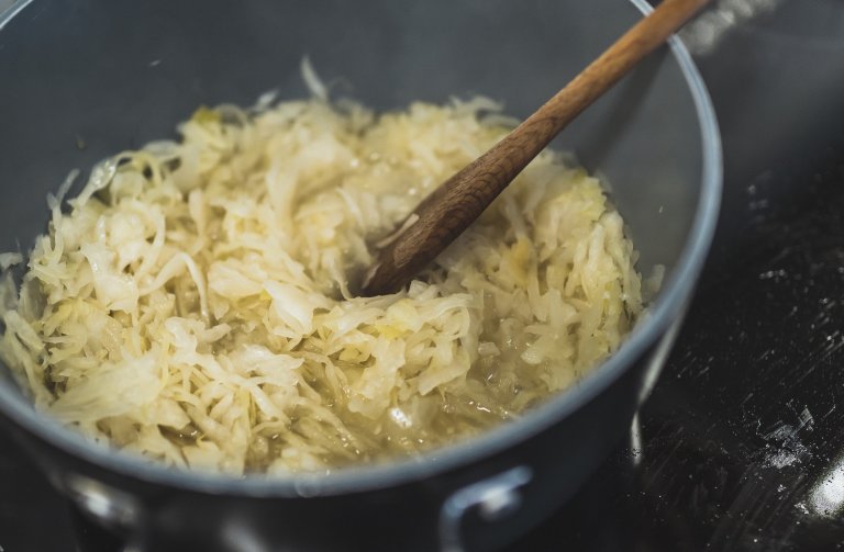 - 2. Poté dejte do hrnce zelí i s nálevem, zalijte ho vývarem (200 ml) a nechte vařit na mírném plamenu cca 10 minut.
