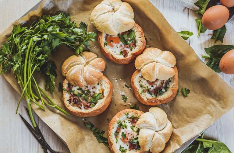 Hravá a nenáročná snídaně, kterou si zamilují také vaše děti? Rozhodně naše vejce v housce plné sýra, slaniny, vajec, bylinek