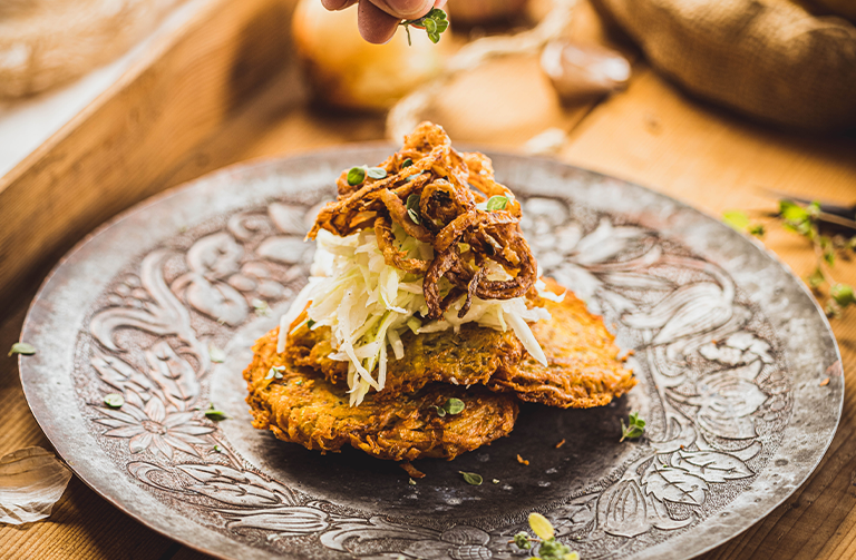 Bramboráčky na sádle, čerstvé křenové zelí, smažená cibulka